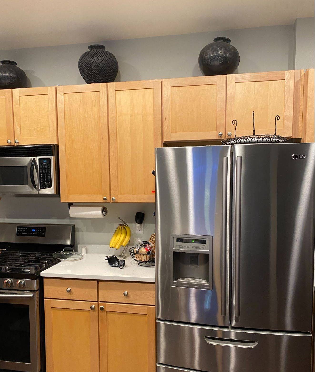 This customer called us in to repaint their cabinets for a more modern look. They decided to go with the color Antique Tin (from Behr) on bottom and extra white on top. Giving these light oak cabinets a fresh coat of paint completely changed the look and feel of the kitchen for a much lower cost than replacing the cabinets altogether.